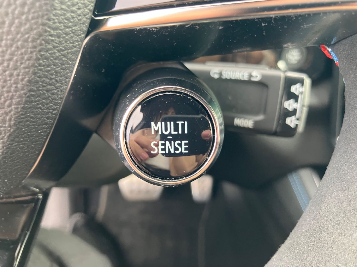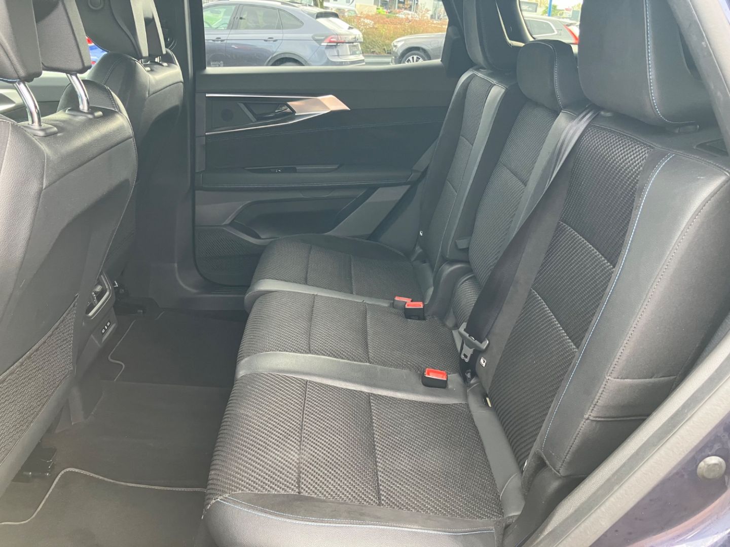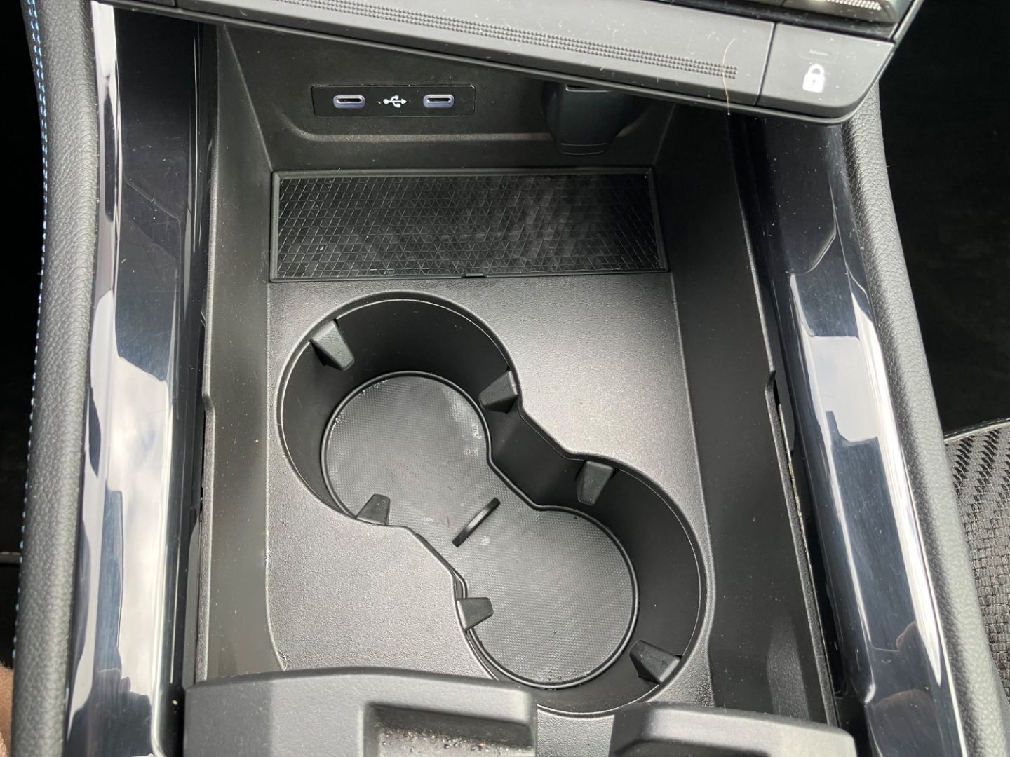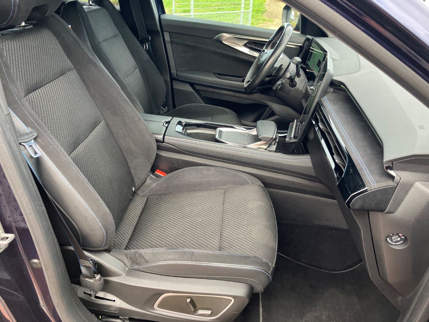 • accoudoir de porte en alcantara® et accoudoir central en TEP avec surpiqures bleues